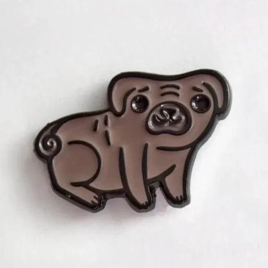 This little pug enamel pin measures approximately 1" wide and fastens with a butterfly clasp at tha back.