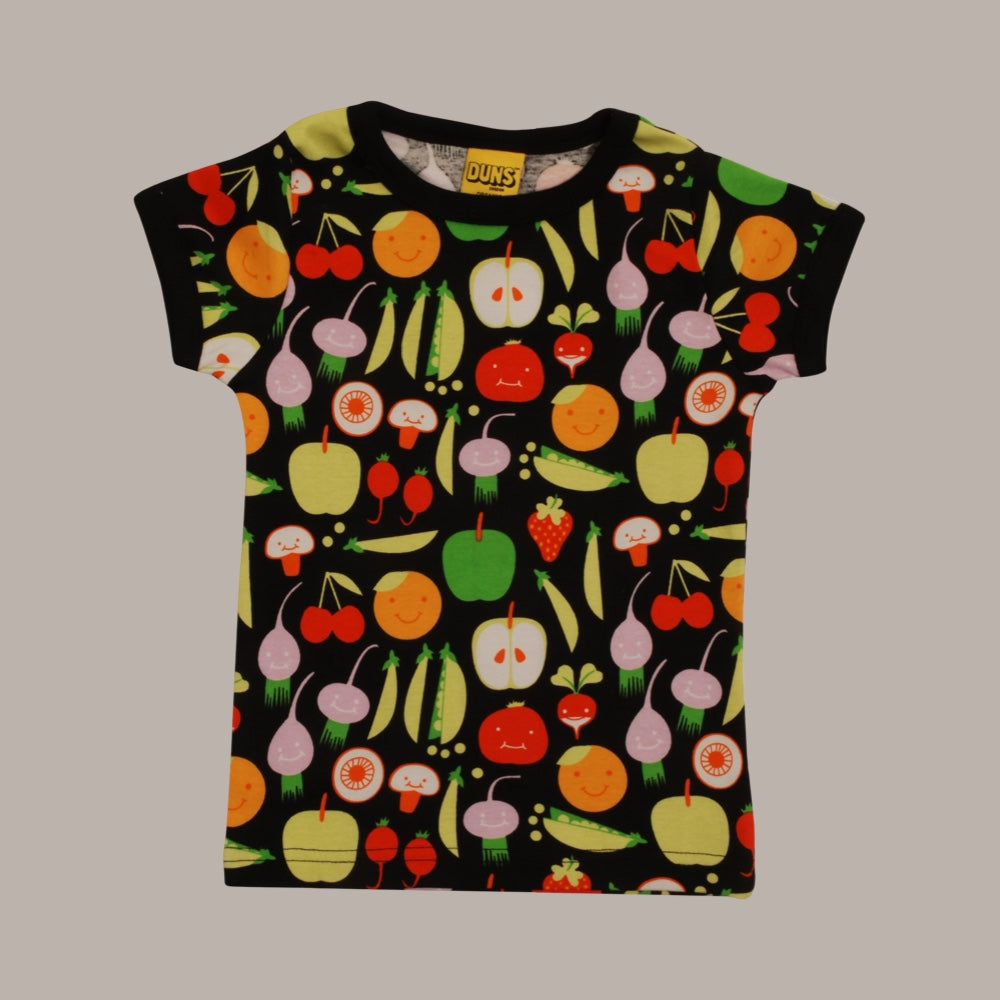 The fabric pattern features a cornucopia of vegetables and fruits on a black background.