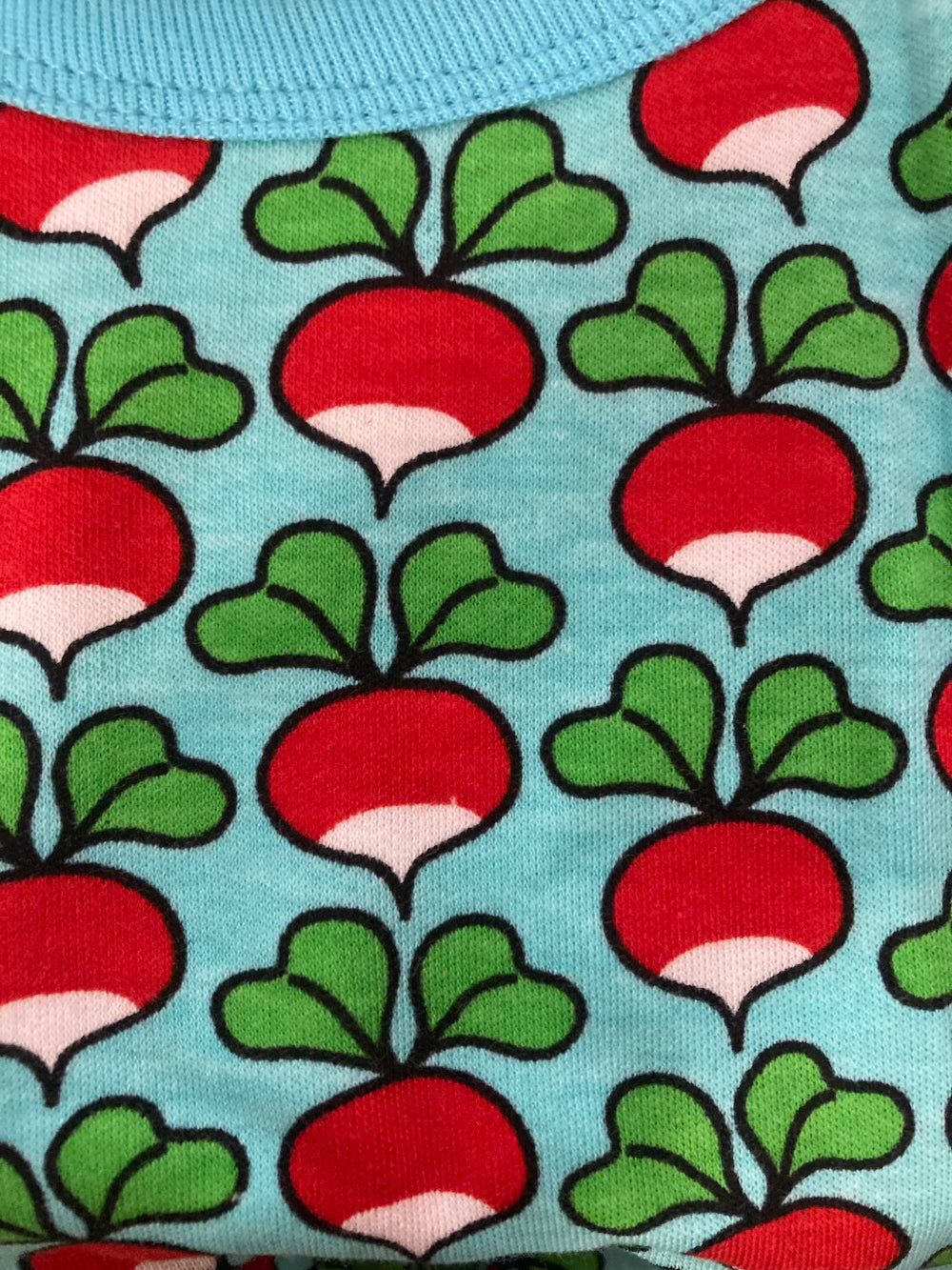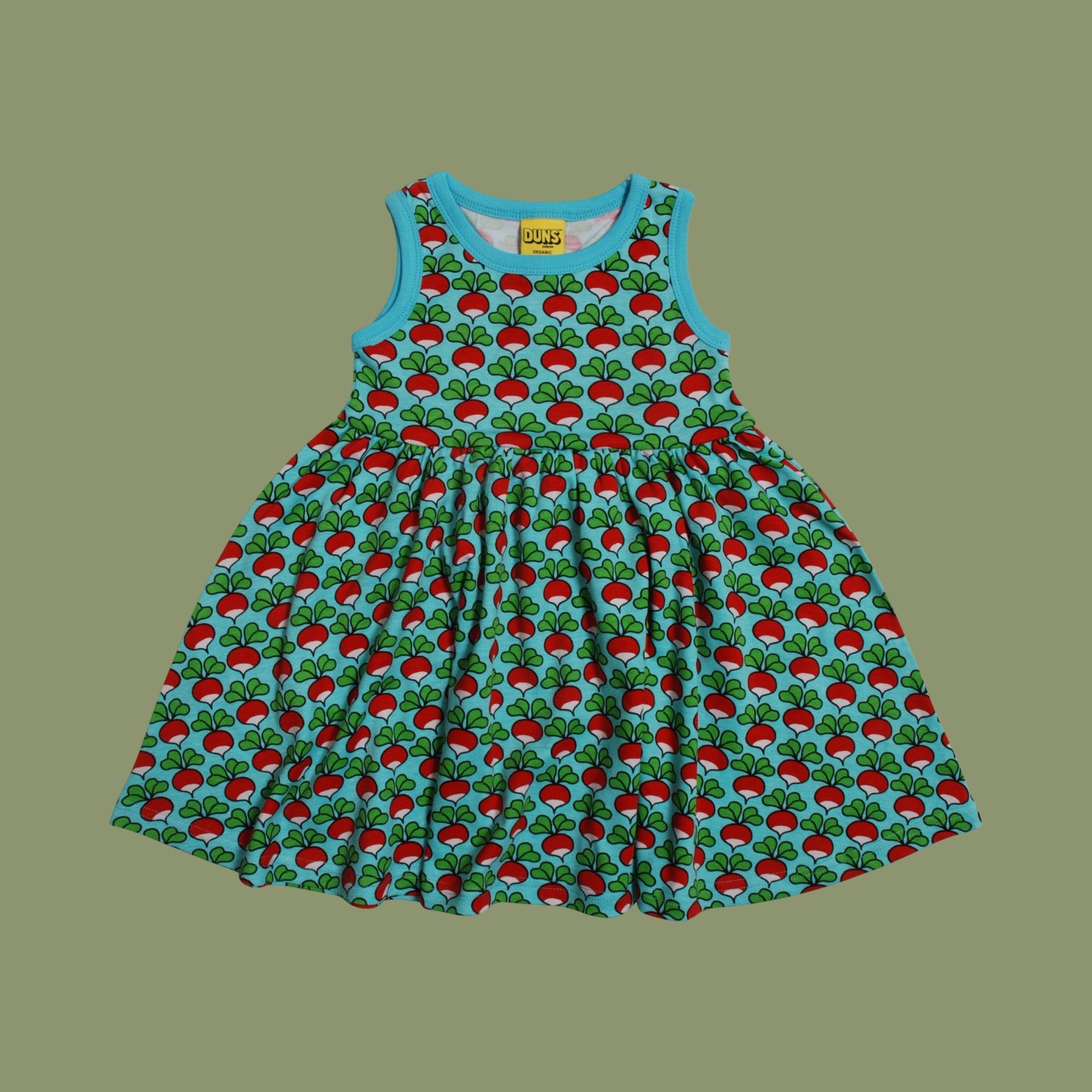 This sleeveless dress is covered with red and white radishes with green leaves, a light blue coloured background and light blue collar and sleeve trim.