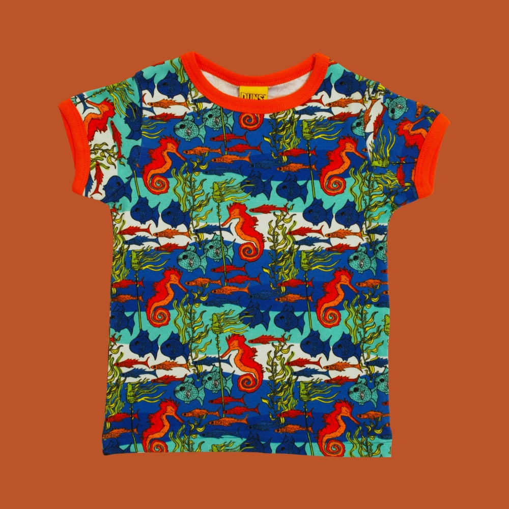 The seahorses print has seahorses and other fish swimming in the ocean. The colours are bright orange, blue, lime green and aqua. Fabric placement may vary from the picture.