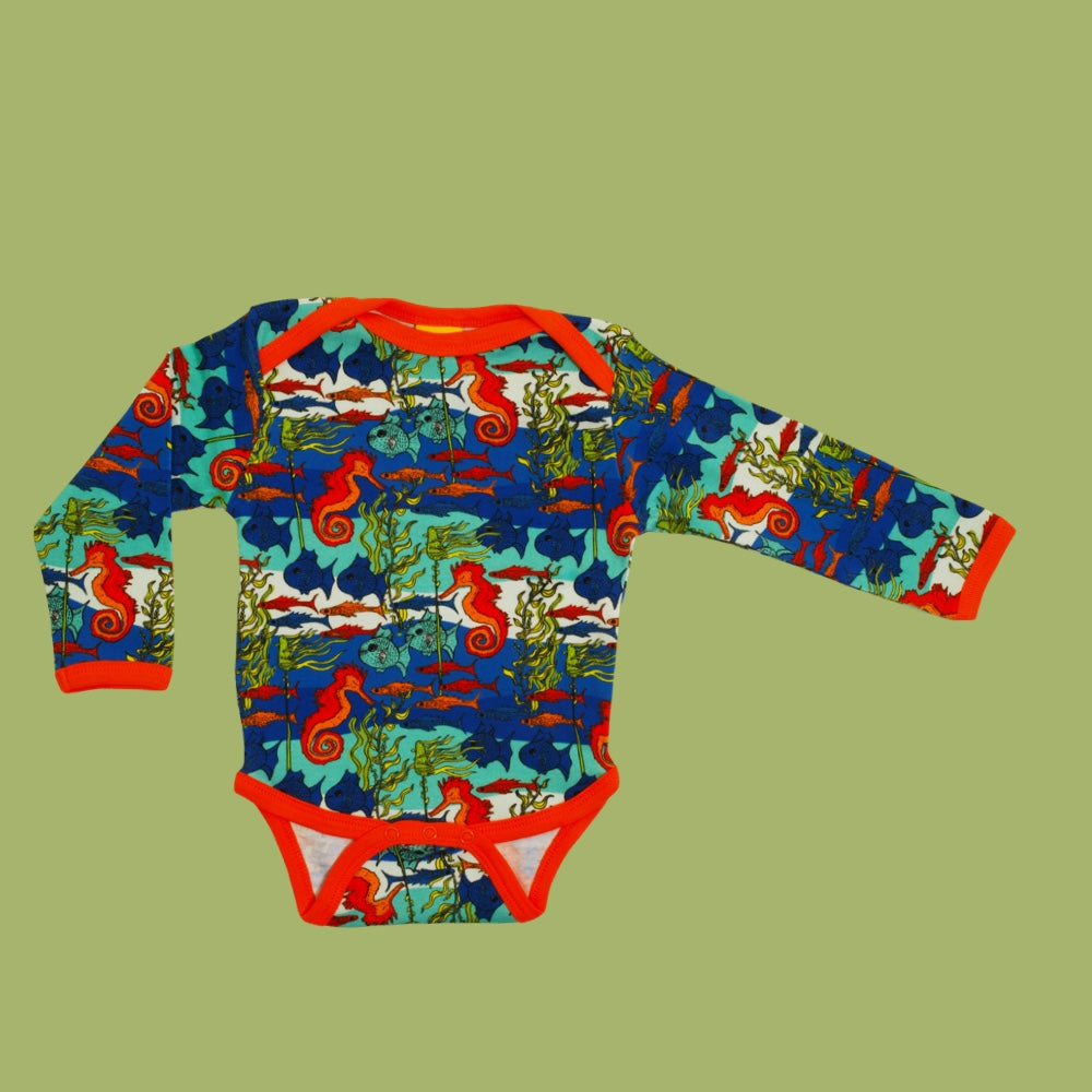 The seahorses print has seahorses and other fish swimming in the ocean. The colours are bright orange, blue, lime green and aqua. Fabric placement may vary from the picture.