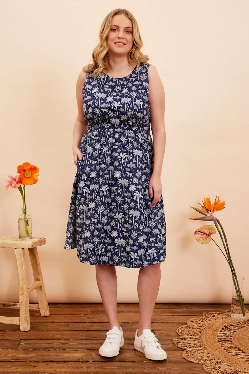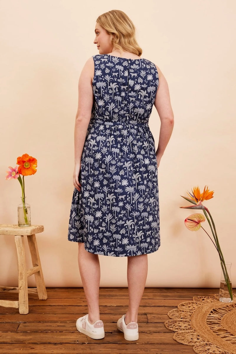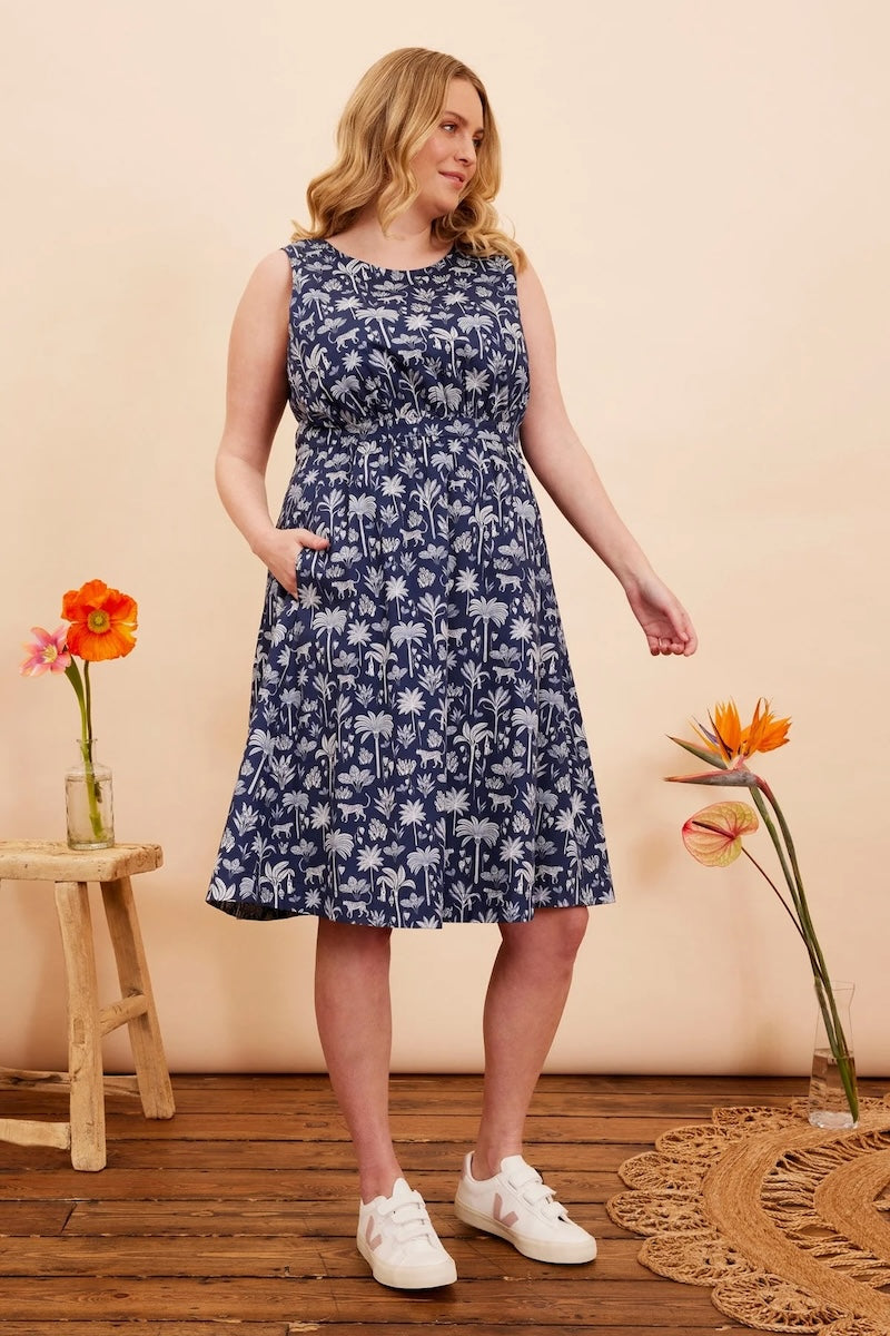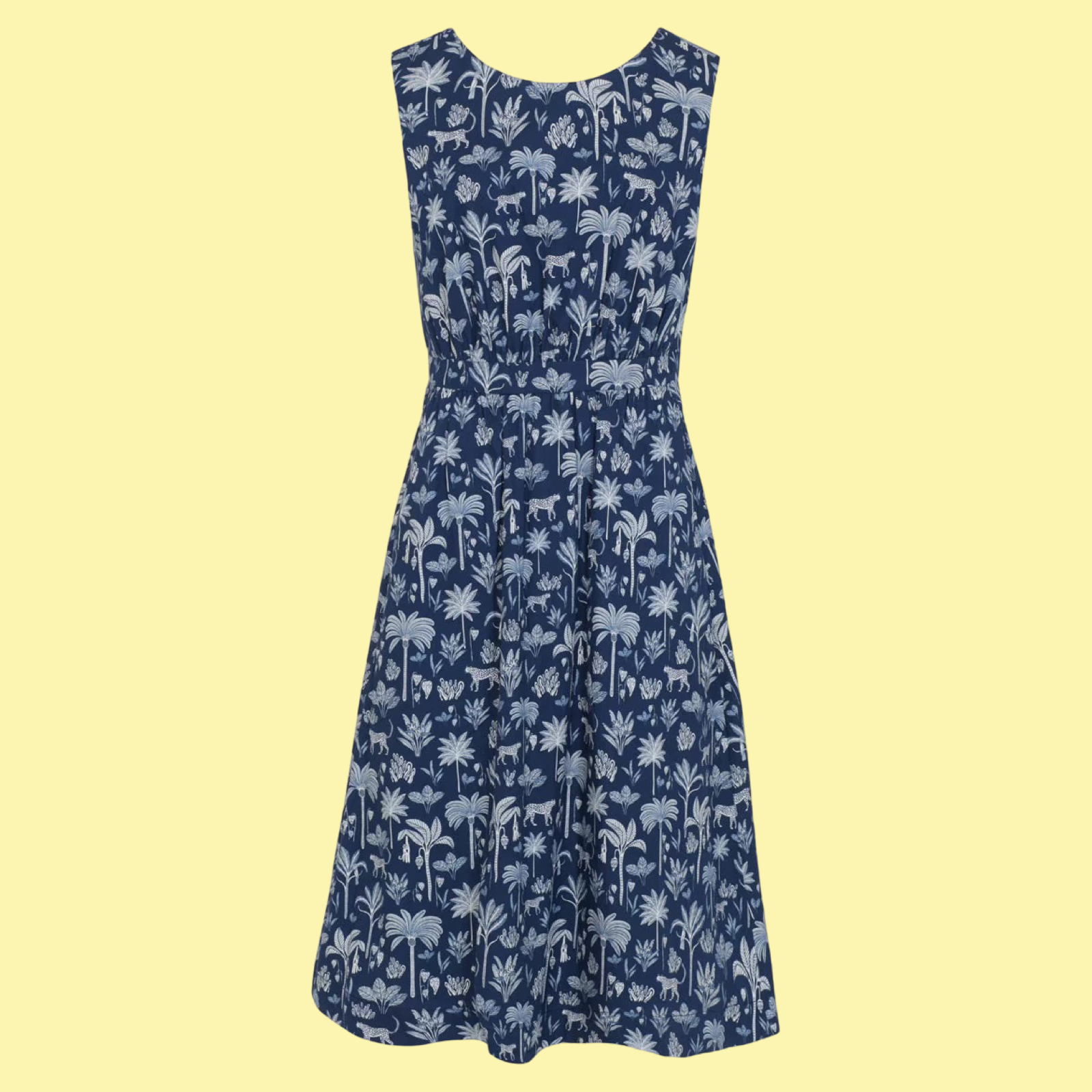 Emily & Fin's Lucy dress is one of our most popular styles. With a nipped-in waist, gathered knee-length skirt and a sleeveless high neck, it’s easy to see why. In a blue jungle print complete with leopards and monkeys, you'll love Lucy all summer long.