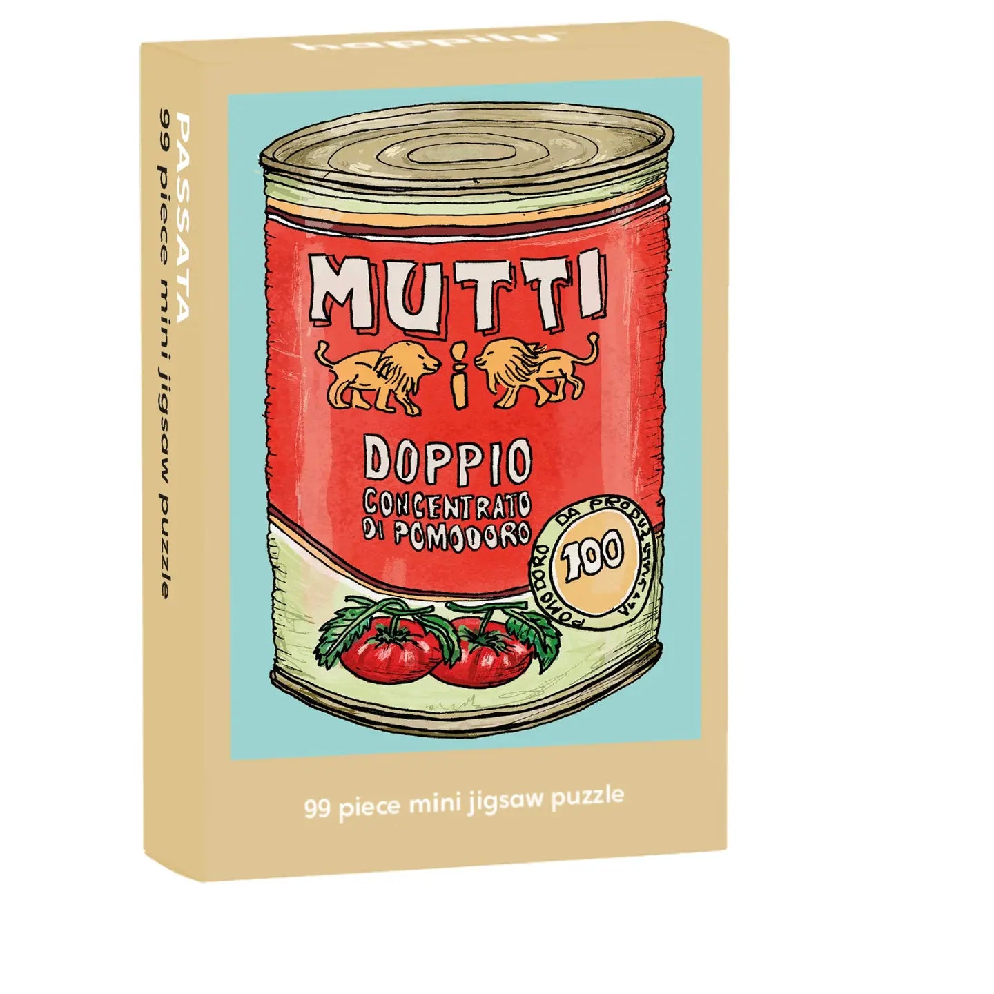 A mini jigsaw puzzle featuring an illustration of a tin of passata by Natalia Yañez-Stiel. Packaged in a cardboard box, these make cute little gifts or a fun activity for your weekend.
