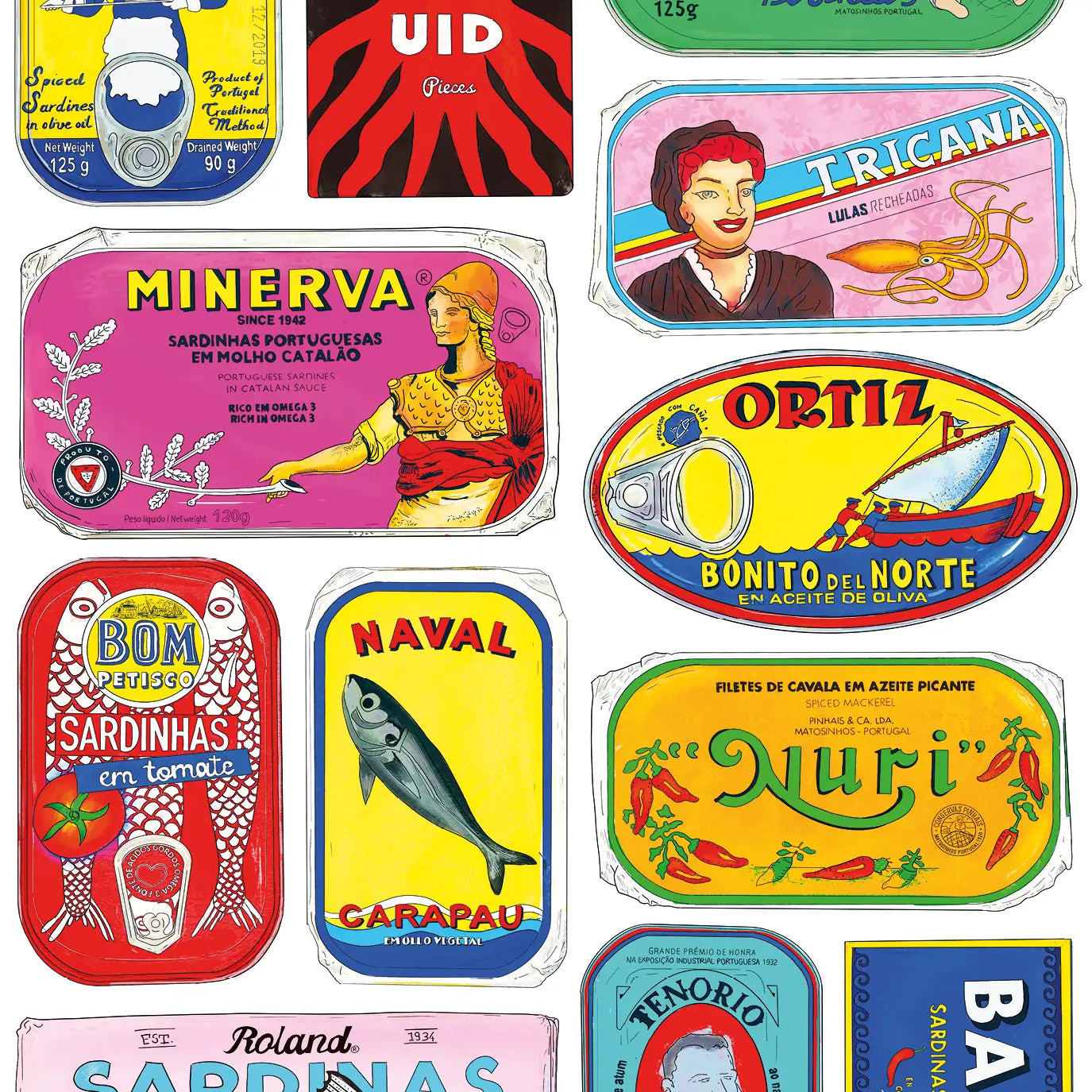 A 1000 piece jigsaw puzzle featuring an illustration of tinned seafood by Natalia Yañez-Stiel.