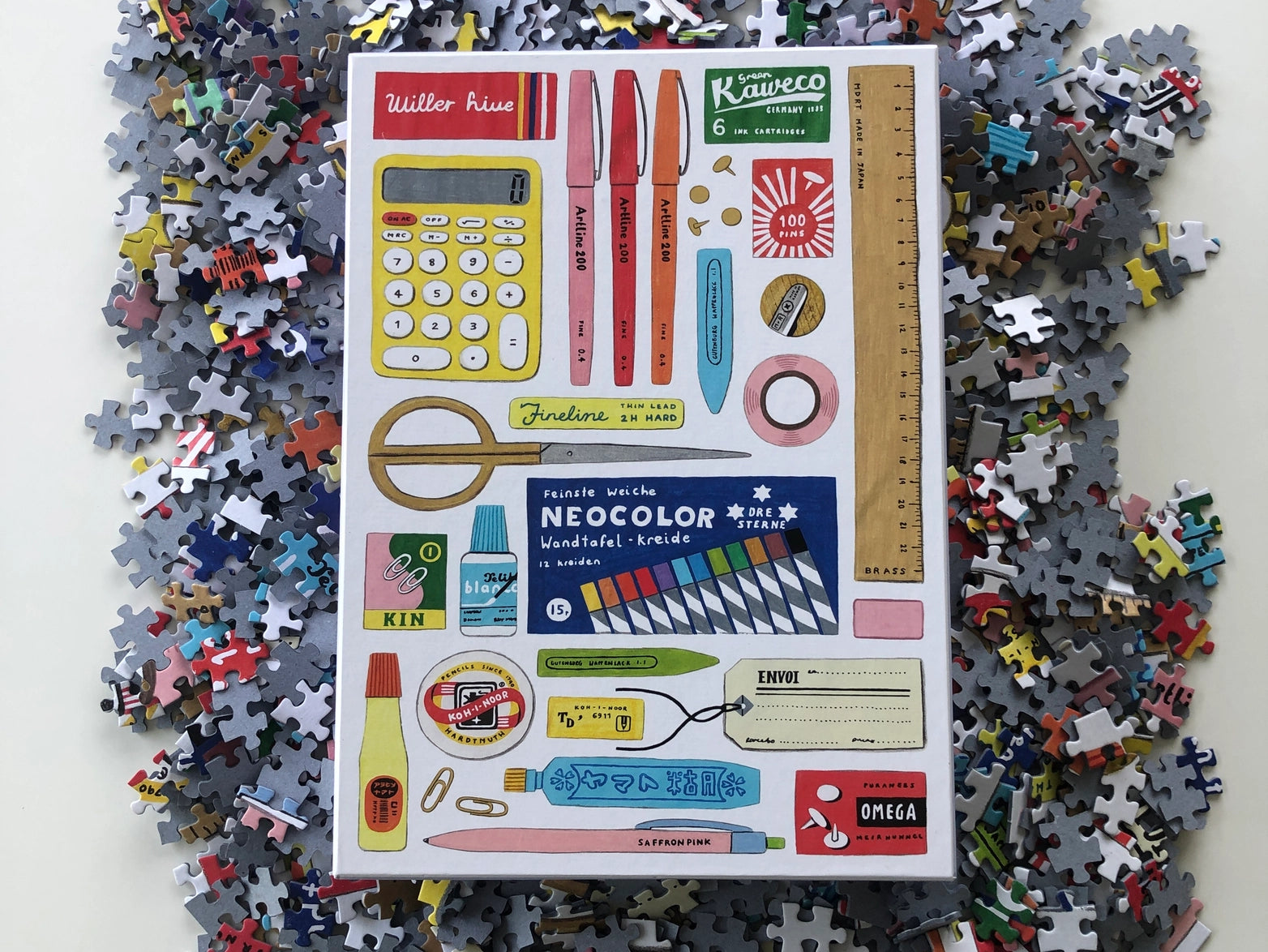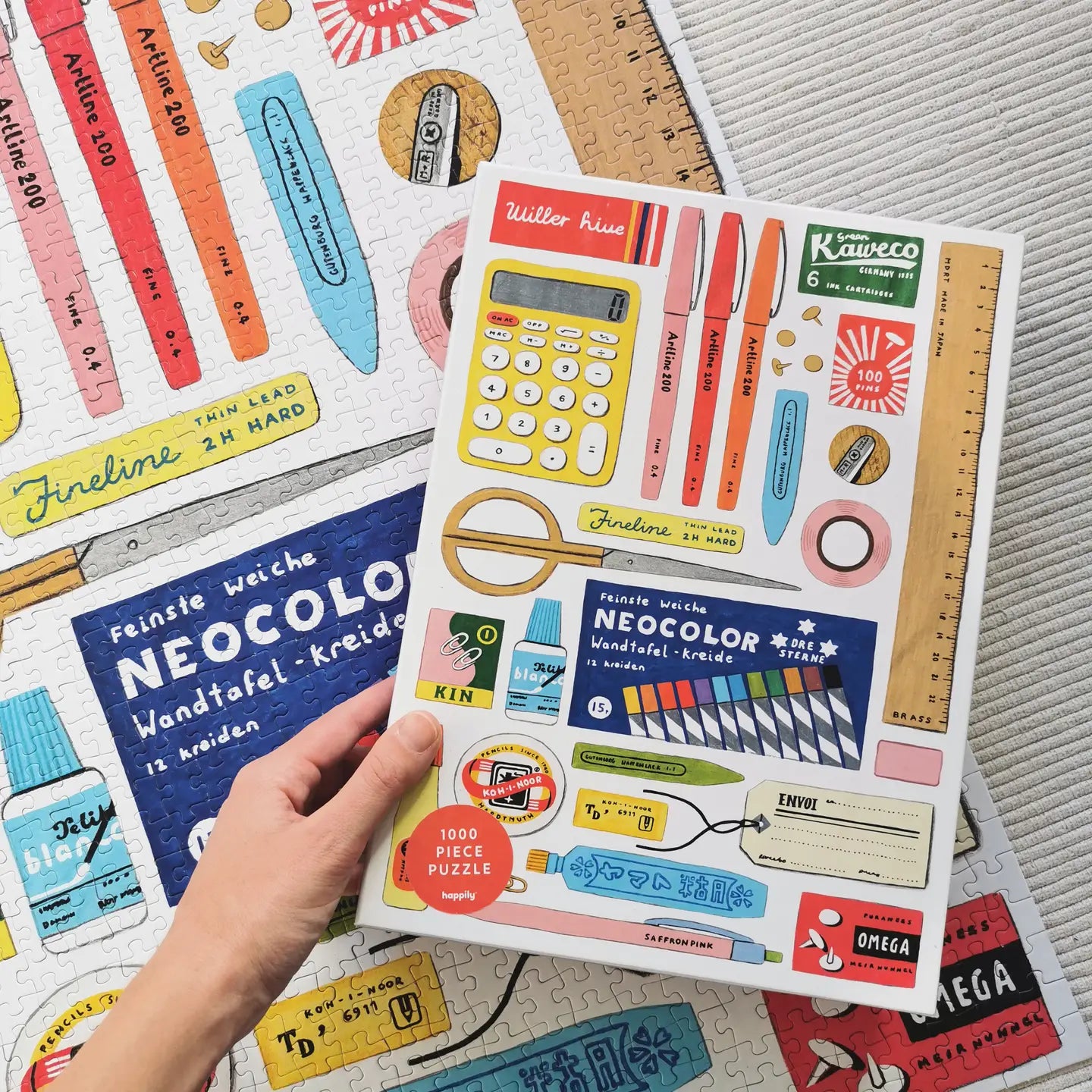 A 1000 piece jigsaw puzzle featuring a fun illustration of iconic stationery by Holly Maguire.