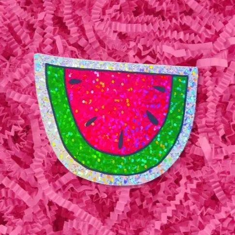 A glittery watermelon sticker that shines with a holographic glittering effect. It's waterproof with a UV screening to protect from sunlight and weather, ideal for laptops, water bottles, or any smooth flat surface - even your car!