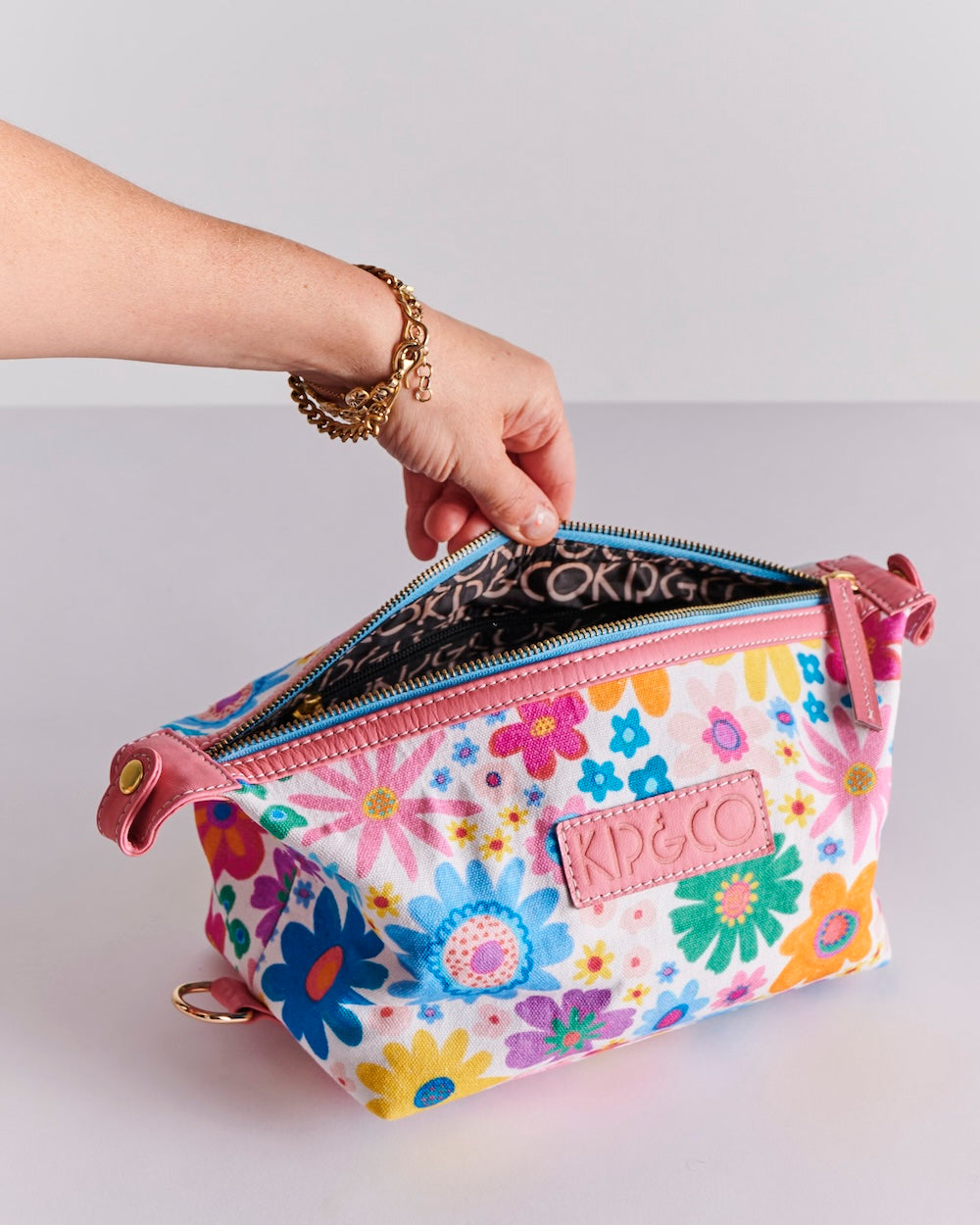 Pack up and store your toiletries with this stripey wash bag. In a moody tartan pattern of rich ochre brown, teal blue, green and nude pink with brown leather branding and zip details.