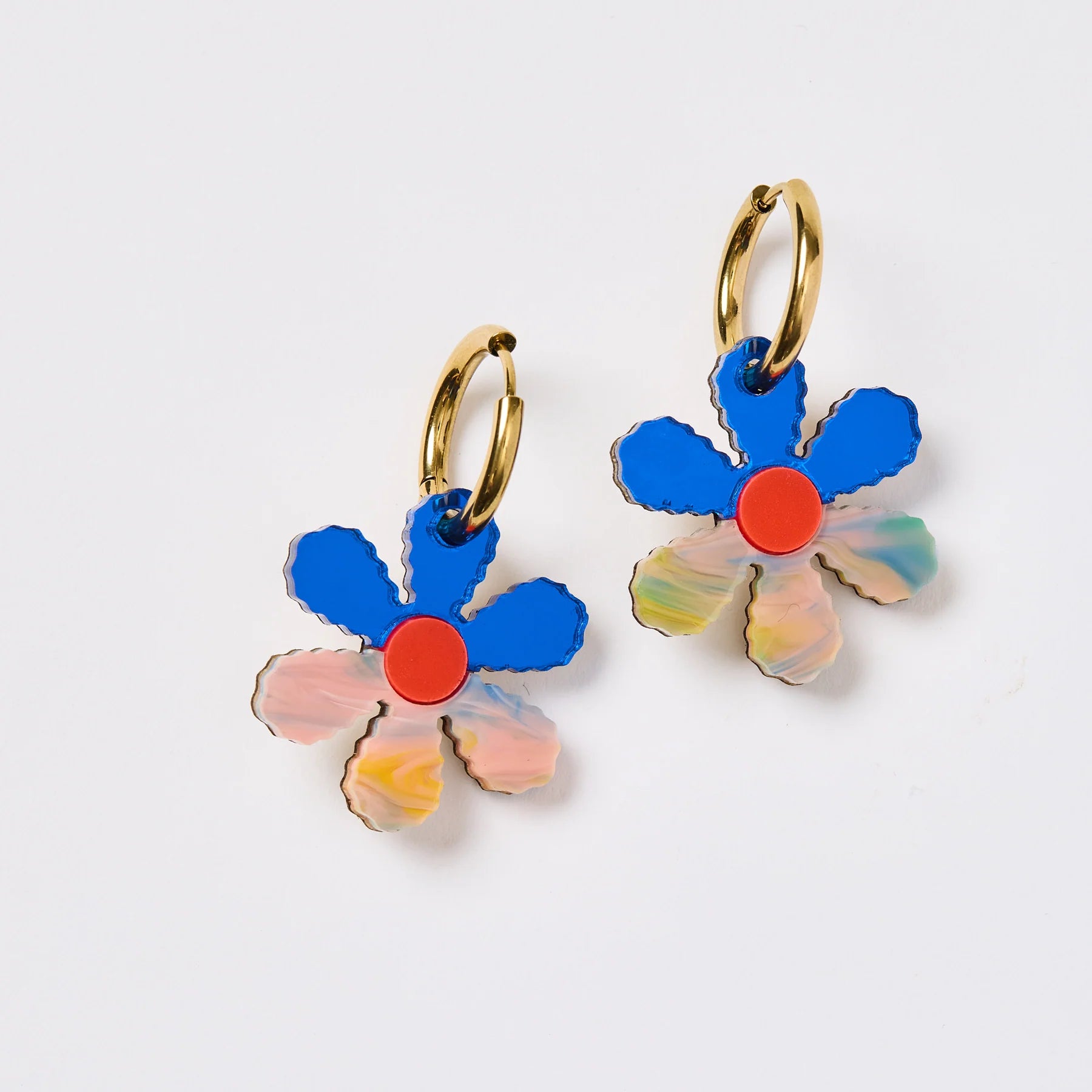 This pair of handmade earrings feature daisies in cobalt and peach tones with a watercolour effect. They hang on surgical steel (gold) hoops.