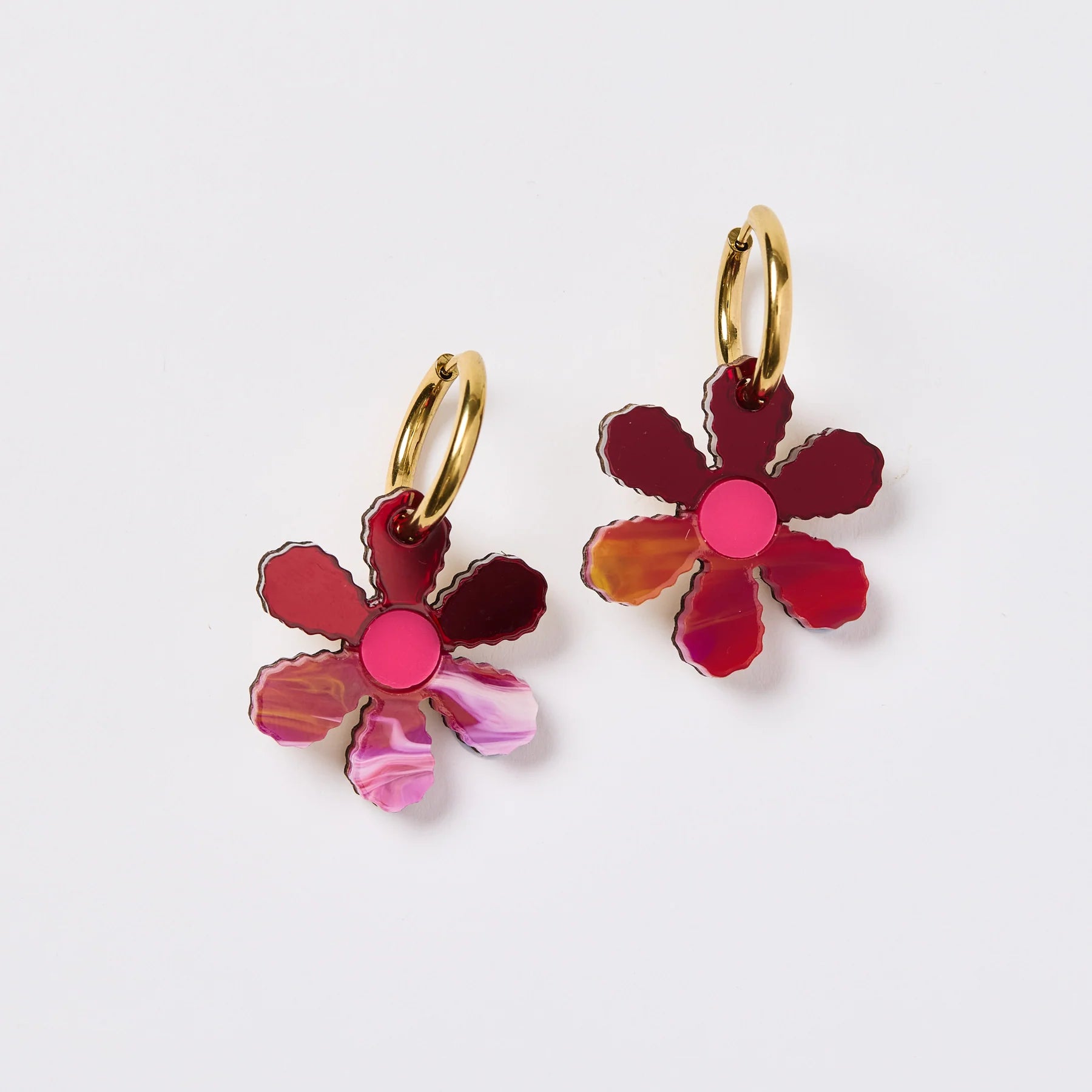 This pair of handmade earrings feature daisies in deep magenta tones with a watercolour effect. They hang on surgical steel (gold) hoops.