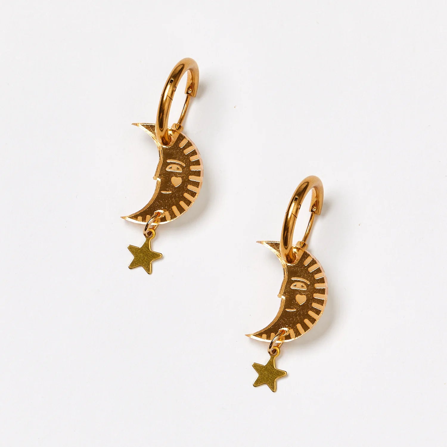 This pair of handmade earrings features one gold star hanging from a pink moon, itself hanging on a gold tone, surgical steel hoop.