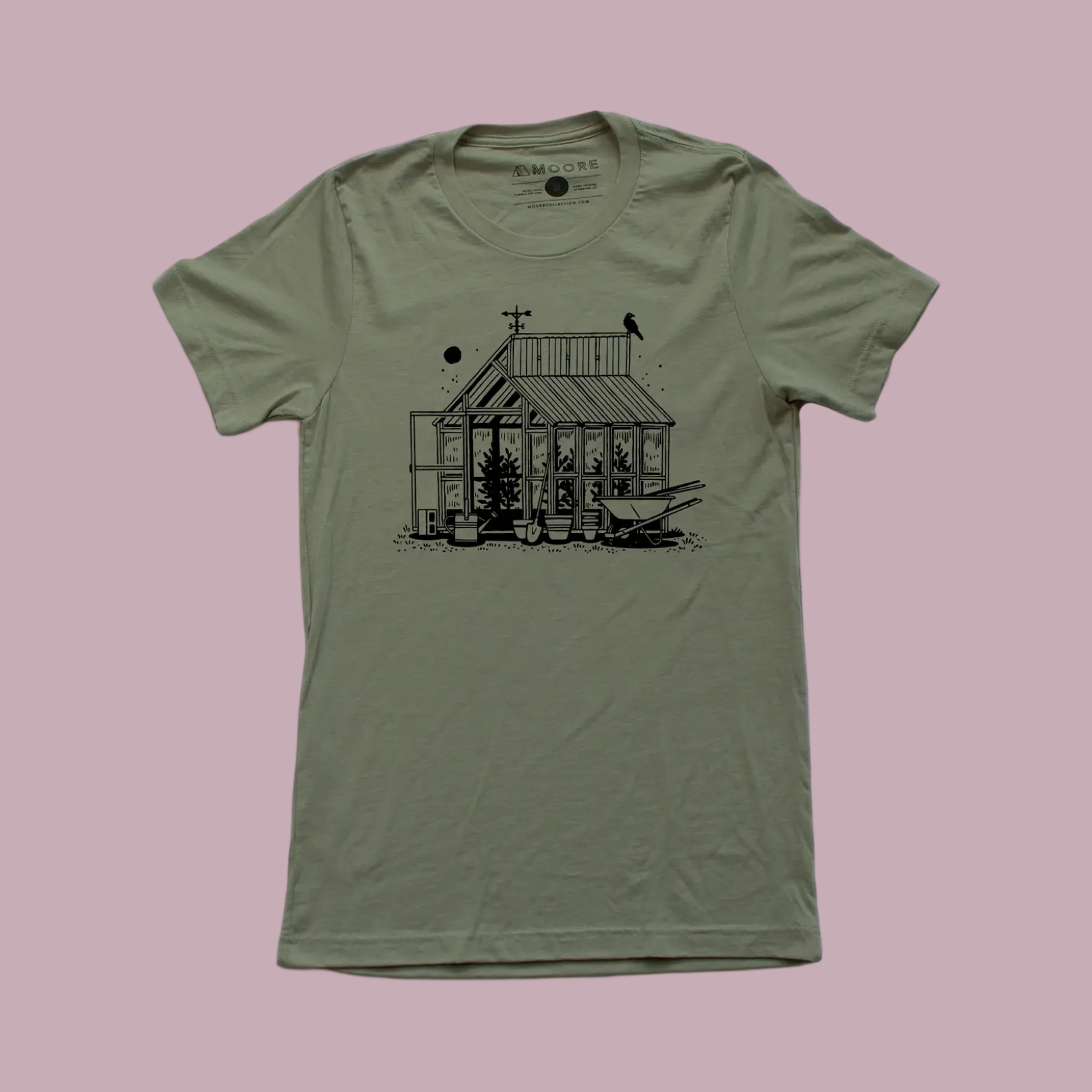 As the name suggests, the greenhouse t-shirt has a print of a greenhouse filled with plants. It is printed in black ink on a khaki marle tee.
