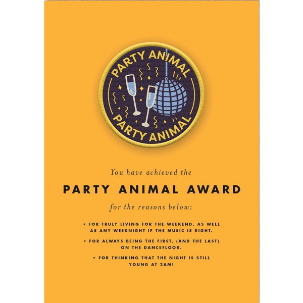 This card comes with an iron on patch! A special award for that friend who is always the life of the party.