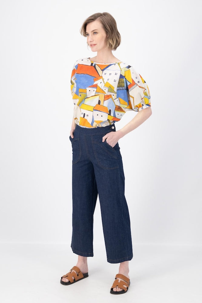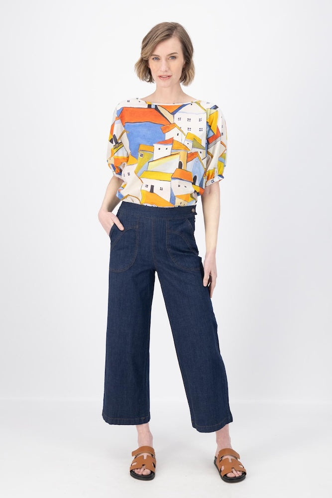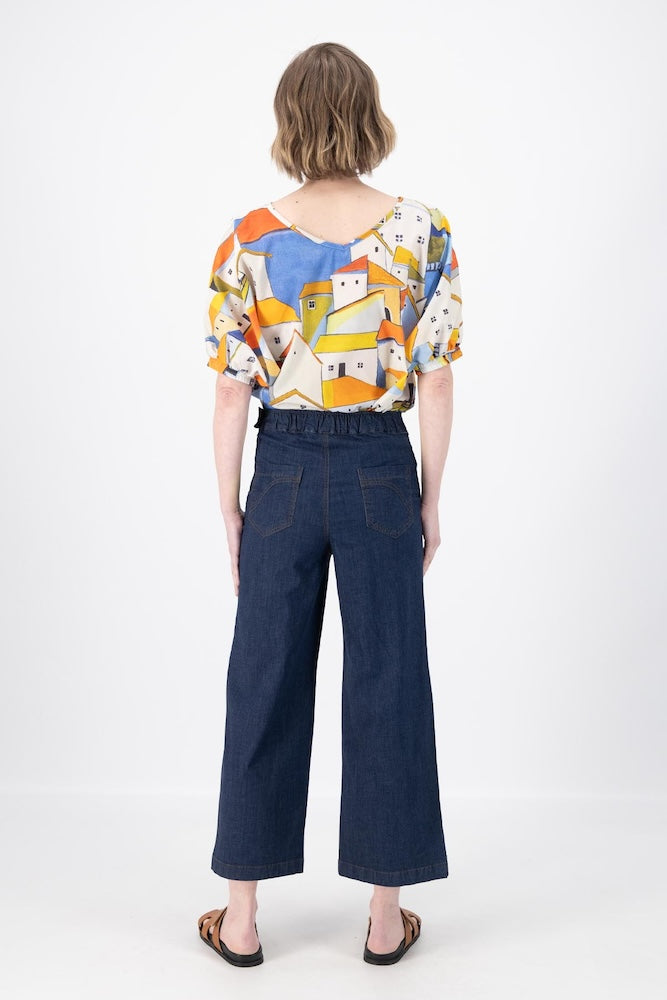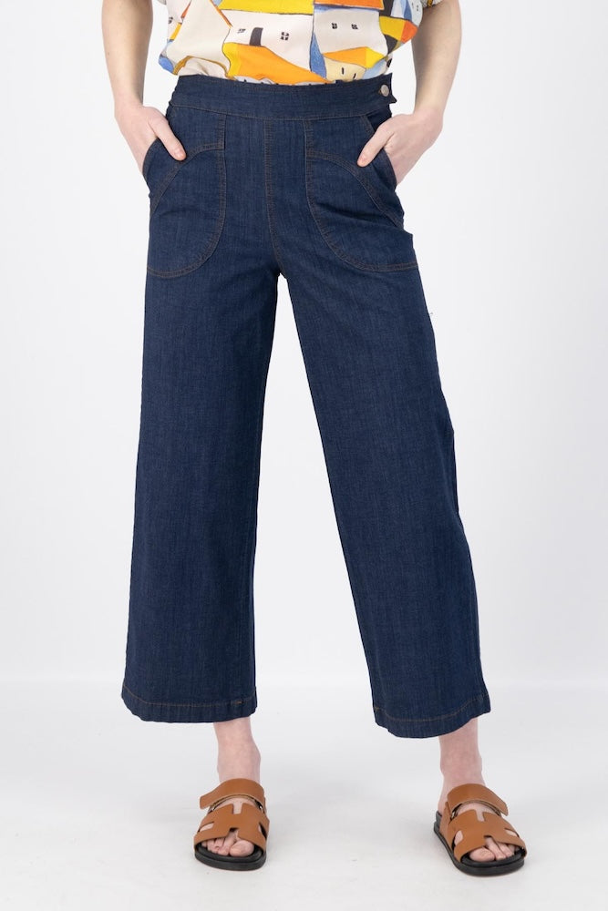 Your wardrobe's new best friend! These denim Peggy pants have a wide-legged and cropped cut, with a button fixture on the side of the waistband. Slightly stretchy and with an elasticated waistband at the back, you'll be feeling comfy and looking stylish!