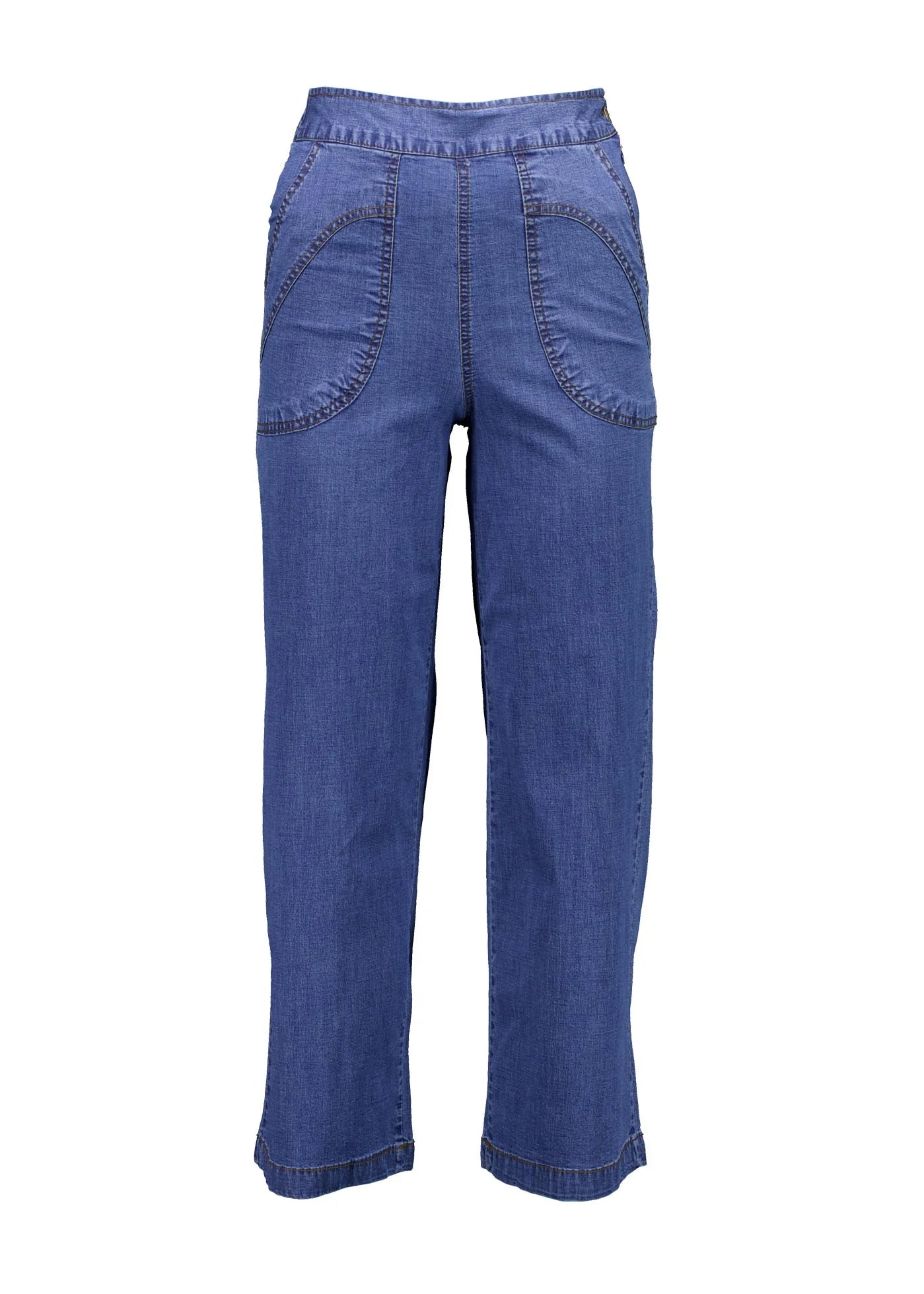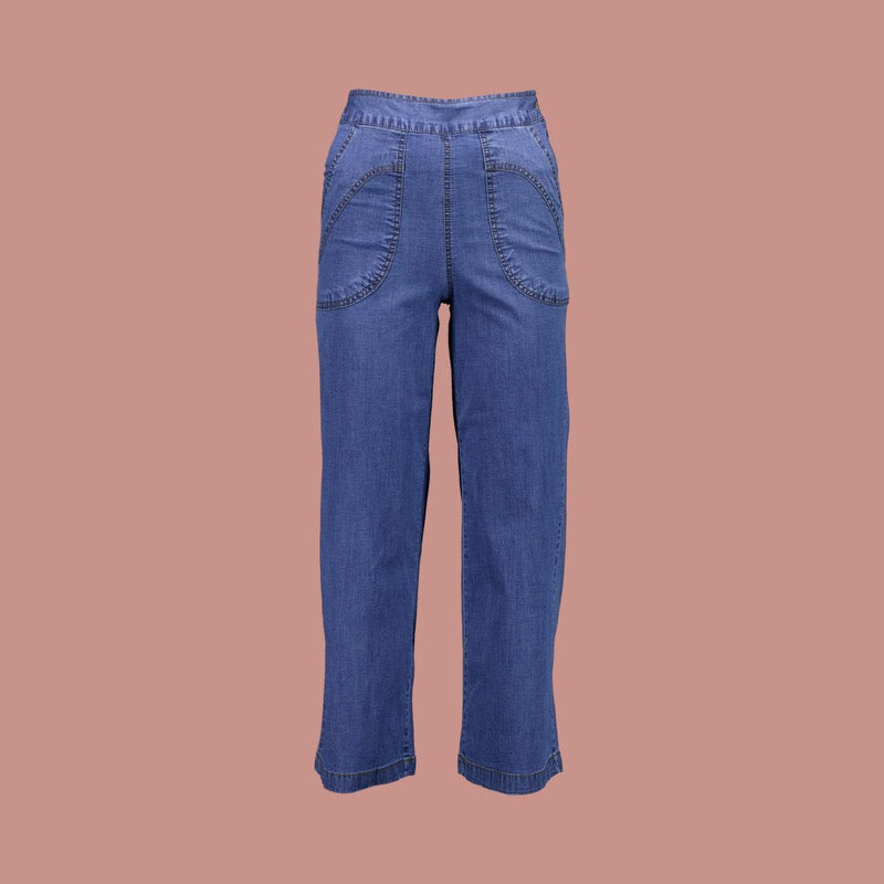 Your wardrobe's new best friend! These denim Peggy pants have a wide-legged and cropped cut, with a button fixture on the side of the waistband. Slightly stretchy and with an elasticated waistband at the back, you'll be feeling comfy and looking stylish!