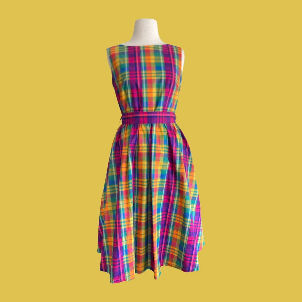 This frock is cut in such a classic fit-n-flare shape. With a full skirt gathered at the waist, a slight scoop at the back (but sitting above the bra line) and a boat neck at the front. It has pockets in the side seams and comes with a matching waist tie. And don't you adore the jewel-toned plaid?
