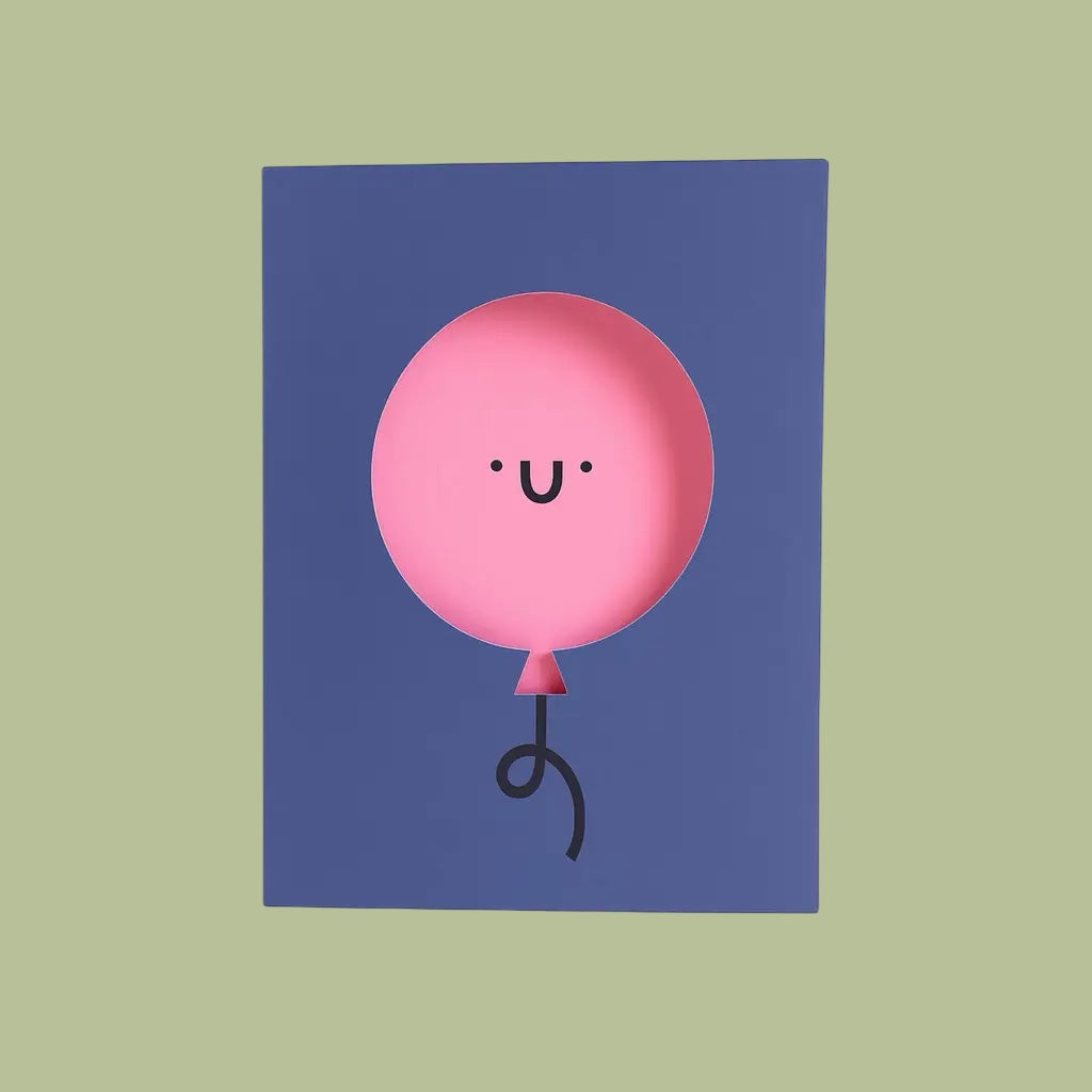 A cut out balloon shape reveals a happy balloon face! An excellent birthday card for all ages. Designed by Ashley Le Quere.