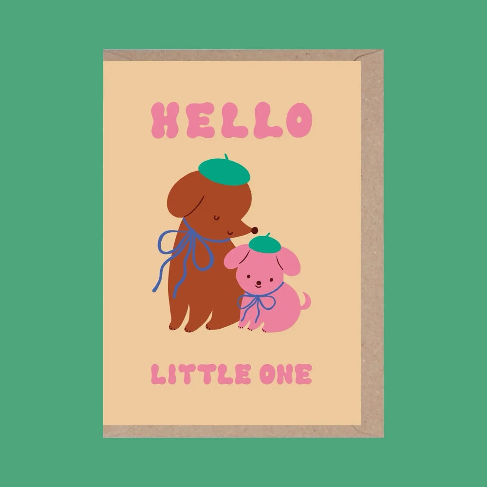 A super sweet card to celebrate the birth of a new baby with a couple of beret-wearing dogs. Text reads 'hello little one.' Features artwork by Wera Krason.