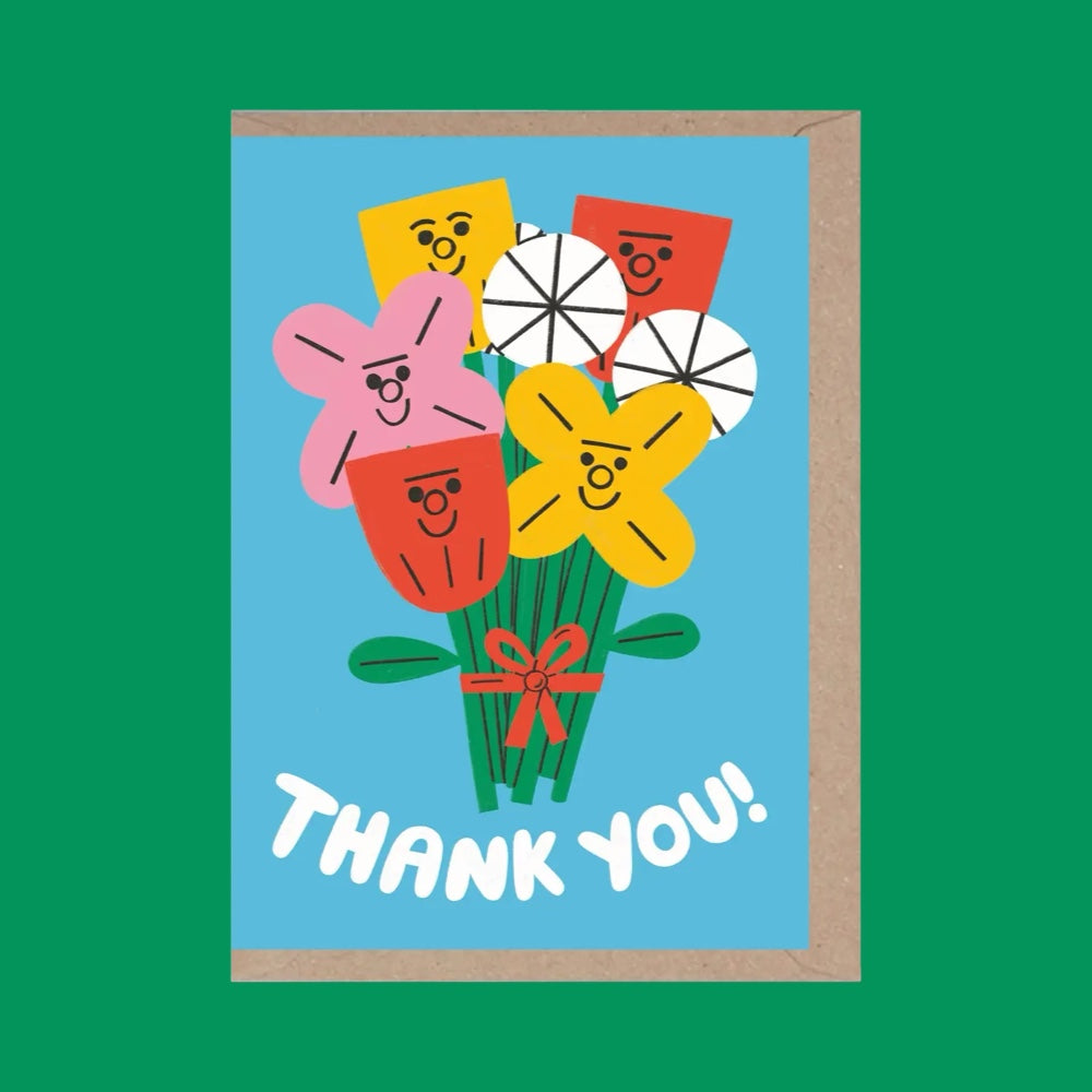 A bunch of happy flowers to say thanks. Card reads 'thank you!' below a bright and bold posy. Features artwork by Tess Smith-Roberts.
