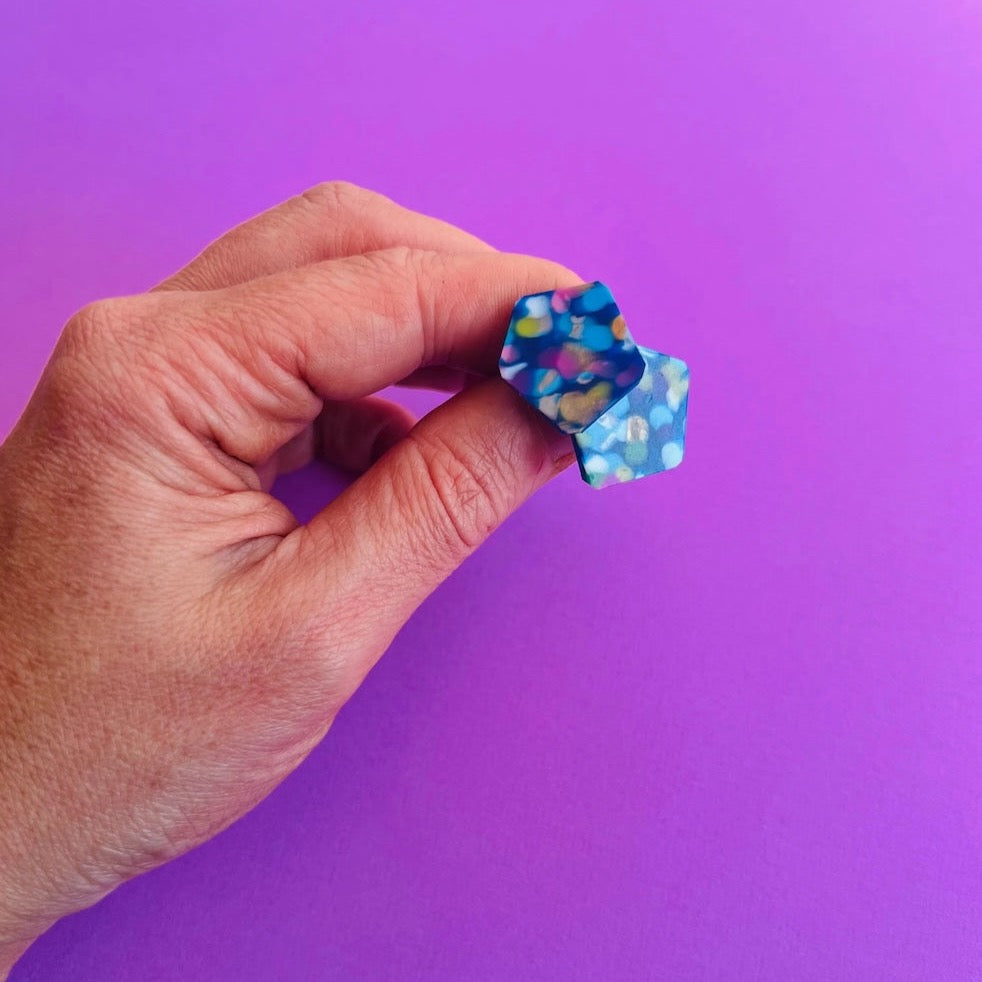 These colourful earrings are made from 100% recycled single use plastic with surgical steel earring backs. Each pair is unique, there are slight variations between each pair and even between earrings in a pair. Please use the images as a guide, each pair is the same shape and size, and is made up of the same colours.