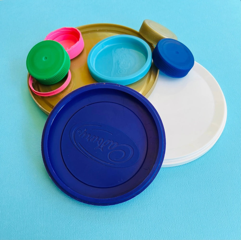 Handmade in Australia. The single use plastic (think milk bottle lids and the like) is melted down and set into different colours combos and shapes.