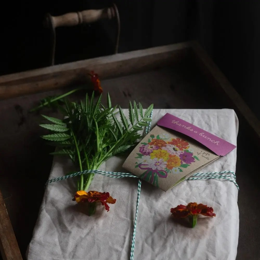 Inside the Gift of Seeds packet is a separate seed sachet containing a cheerful mix of cosmos, zinnia, and marigold seeds. Bright, easy-to-grow and quick-to-flower blooms that bring colour, life, and joy to any garden or pot.