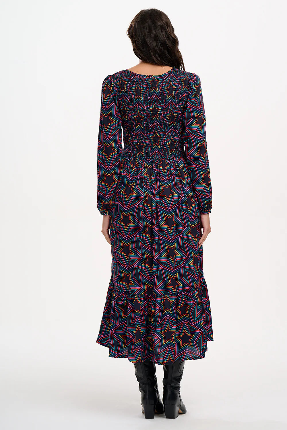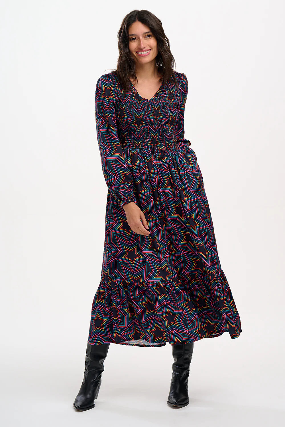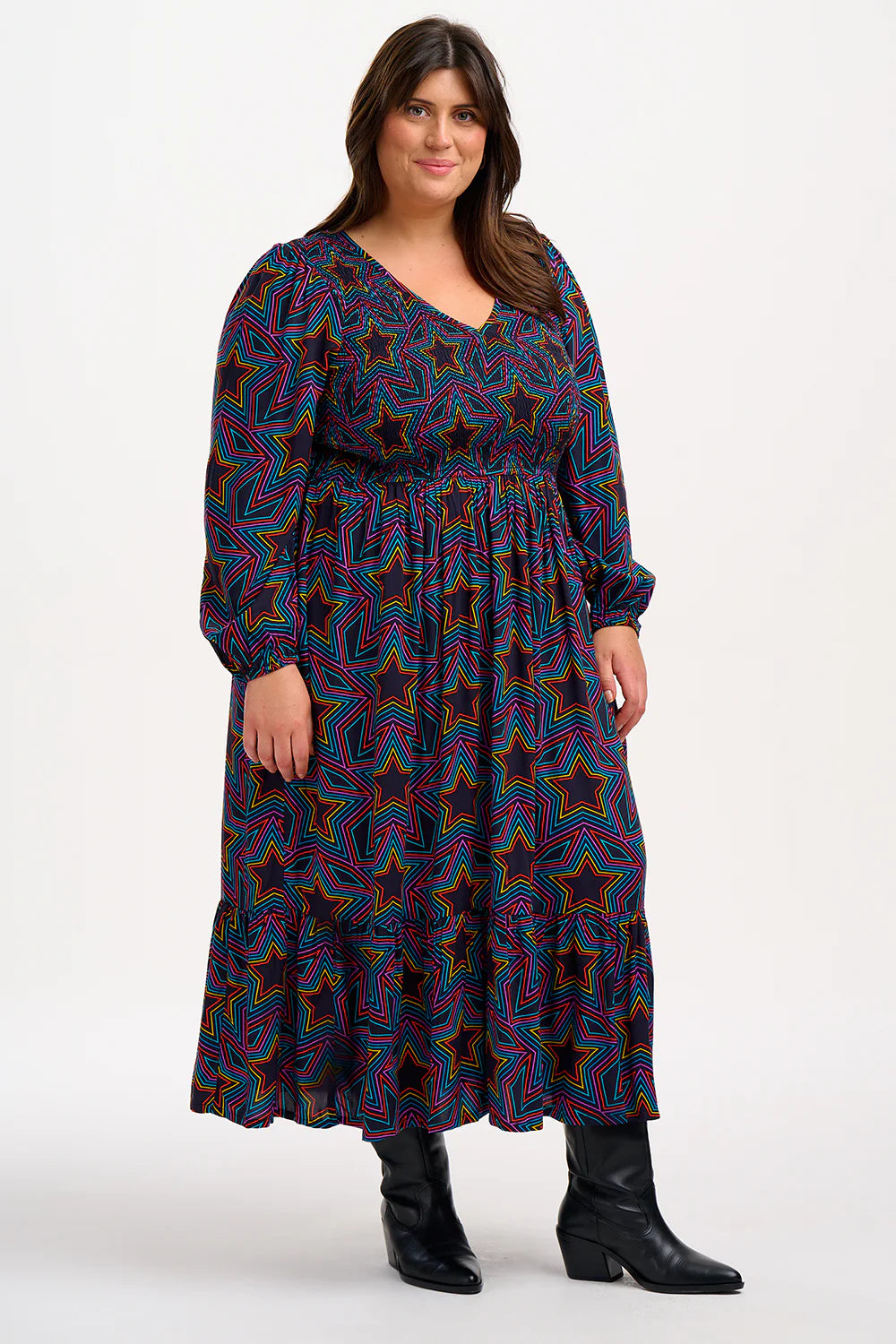 The Amberley frock is cut from a '70s inspired, multi-coloured star fabric! It has long sleeves, a v-neck, shirred bust and a full midi skirt. Like all the best dresses, this one has pockets.