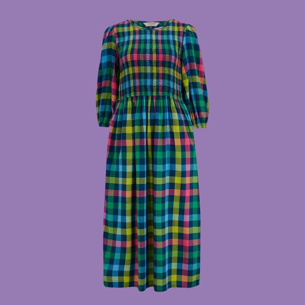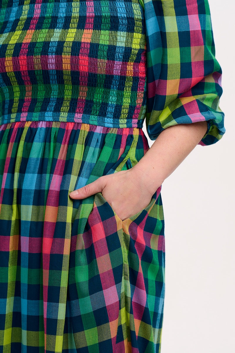 The Ursula dress has a round neck with a shirred bodice and 3/4 length blouson sleeve. The midnight gingham colourway has shades of pink, green and blue. Like all the best dresses, this one has pockets.